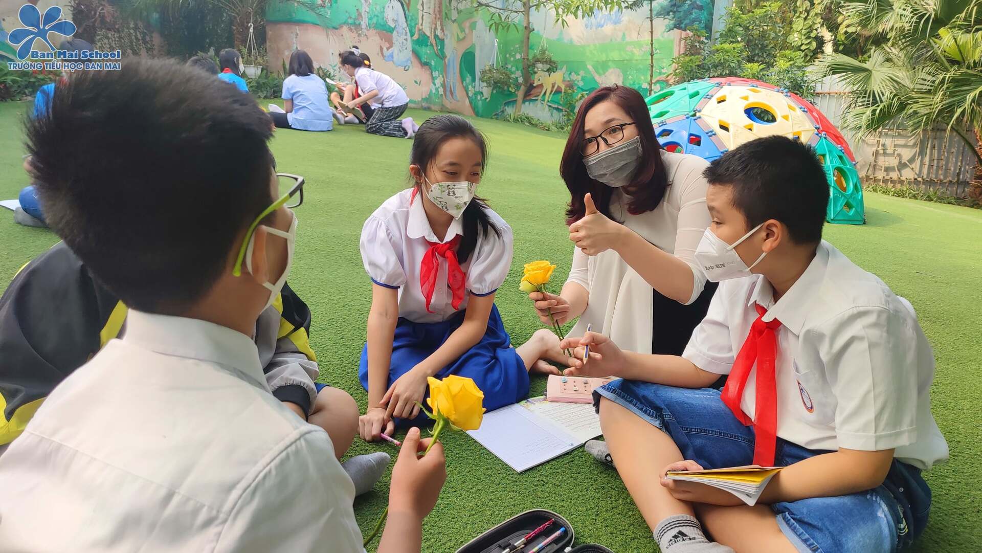 Tận dụng không gian đồi cỏ xanh mát trong khuôn viên trường, cô giáo 5A9 đã cho cả lớp ra hòa mình cùng thiên nhiên, trực tiếp quan sát và viết văn tả một bông hoa.