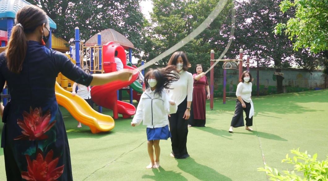 Một giờ ra chơi được kết nối, rộn ràng niềm vui cùng trò chơi nhảy dây. Cả cô Hiệu trưởng cũng hào hứng tham gia nhảy cùng giáo viên chủ nhiệm và học sinh.