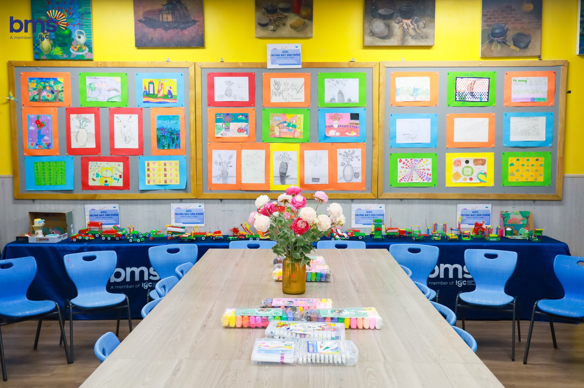 Mỗi bức tranh của học sinh đều được trân trọng trưng bày; mỗi nét cọ mang theo niềm tự hào và dấu ấn riêng. Trong từng góc nhỏ, triết lý giáo dục toàn diện của BMS được thể hiện một cách tự nhiên: học sinh phát triển tư duy sáng tạo, rèn kỹ năng, mở rộng hiểu biết, nuôi dưỡng thái độ tích cực và tìm thấy niềm vui – sự cân bằng tinh thần trong mỗi giờ học nghệ thuật.